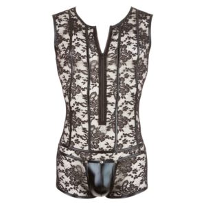 Dieser schwarze Body mit Front-Zip überzeugt in einer aufregenden Kombination aus elastischer, geblümter Spitze und schmalen Wetlook-Streifen. Mithilfe der eindrucksvollen Swell-Funktion lassen Sie Ihre geballte Manneskraft erregend voluminös erscheinen, indem Sie Penis und Hoden spielend leicht durch das innen liegende Stretchloch in den Beutel schieben… Beutel aufknöpfbar. 90% Polyamid, 10% Elasthan.