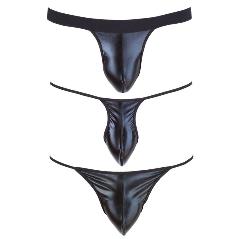 Diese drei Strings kann Mann immer gut gebrauchen: Ministring, Schmalissimo und Jockstring. Alle drei im schwarzen elastischen Wetlook mit starkem Glanz. 90% Polyester, 10% Elasthan, Beschichtung Polyurethan.