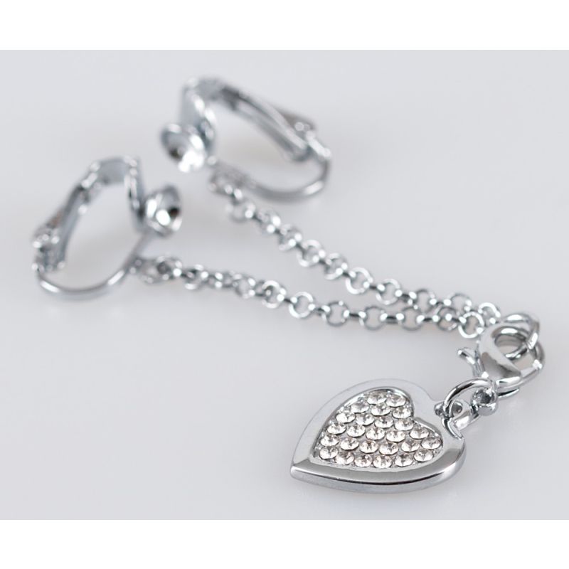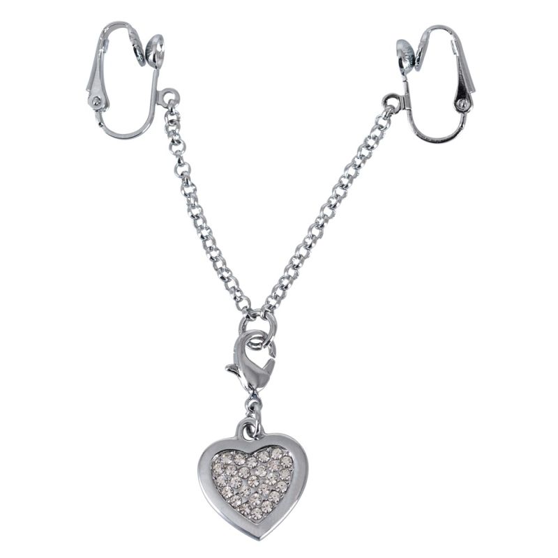 Silberfarbene Intimkette mit strassbesetztem Herzanhänger und Schamlippenspangen.