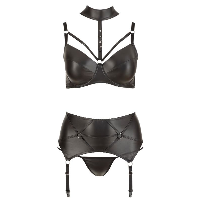 3-teiliges Set im schwarzen Mattlook mit dekorativen Glitzerringen: Bügel-BH, Strapsgurt und String. Bügel-BH mit seitlichen Stäben und leicht gepolsterten Cups. Der verstellbare Dekolleté-Riemen führt zum Halsband mit 2 Knöpfen. Träger verstellbar. Strapsgurt mit 4 verstellbaren Strumpfhaltern. BH und Gurt jeweils mit Hakenverschluss im Rücken.