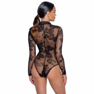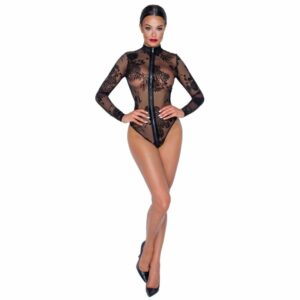 Langarm-Body von Noir komplett aus elastischem Powernet mit feinem Samtflockprint im Blütendesign. Der praktisch-erotische 3-Wege-Reißverschluss verläuft vorne vom Stehkragen bis tief runter in den Schritt.