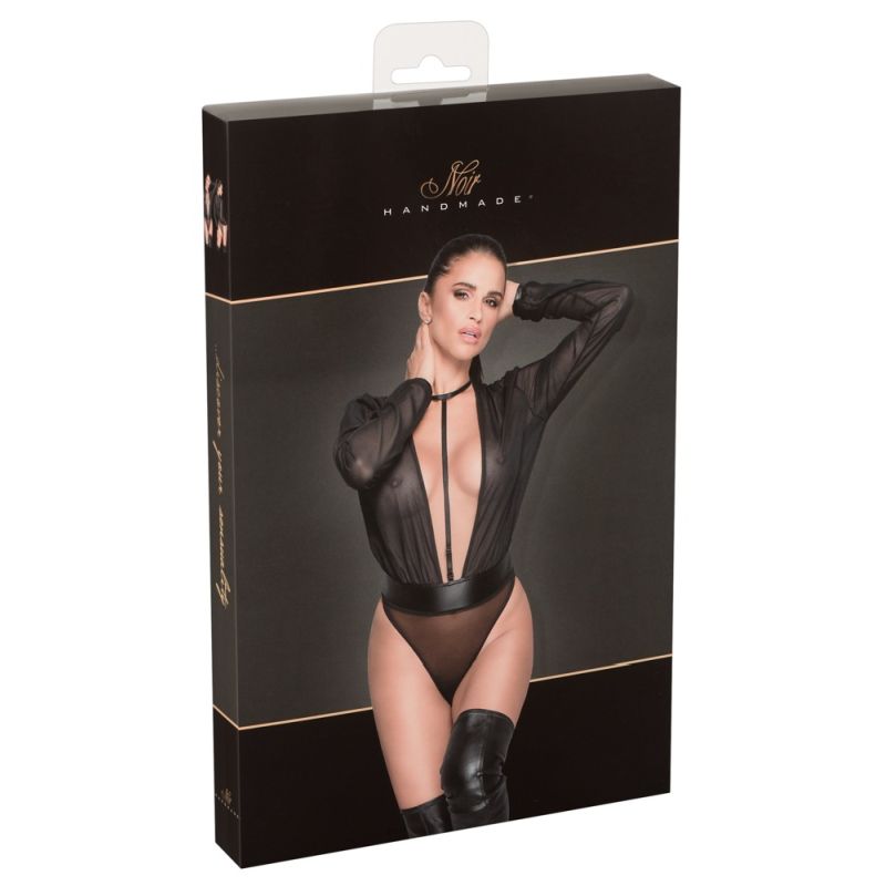 Transparenter Langarm-Body mit blusigem Oberteil aus Chiffon und Höschenteil aus feinem Netz. Extra tief dekolletiert mit verstellbarem Steg zum Halsband mit Clipverschluss. Taillen- und Ärmelbündchen aus Powerwetlook. Höschen mit Haken-Schrittverschluss.