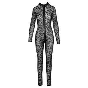 Exklusiver Langarm-Overall von Noir komplett aus elastischem, weichem Powernet mit feinem Samtflockprint in Tiger-Optik. Mit praktisch-erotischem 3-Wege-Reißverschluss, der vom Hals durch den Schritt bis über den Po verläuft.