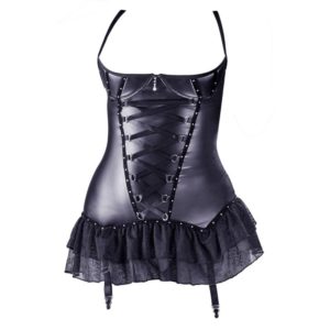 Schwarzes Dessouskleid mit eingearbeiteter, leicht gefütterter Bügel-Hebe, die zwischen den Cups mit einem Strasselement verziert ist. Vorne mit dekorativer Zierschnürung. Aufgesteppte Samtbänder mit Strass verziert. Das Spitzenröckchen ist doppellagig gearbeitet und hinten offen. Im Rücken mit Hakenverschlussleiste. Die Träger und die vier Strumpfhalter sind in der Länge für perfekte Passform verstellbar.