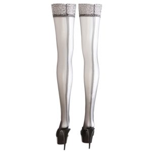 Halterlose Strümpfe mit silberfarbenen Spitzenabschluss und Ziernaht hinten. Das Silikonband im Inneren sorgt für einen sicheren Halt. Oeko-Tex zertifiziert.