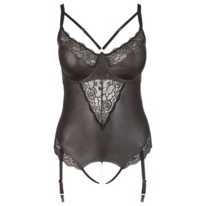 Aufregender Straps-Body mit Cup-Bügeln und verstellbaren Riemen über dem Dekolleté. Im Schritt komplett offen – nur 2 seitliche Strings und eine mittige (die Trägerin stimulierende) Perlenkette, die abnehmbar ist (Karabinerhaken). Die 4 Strumpfhalter sind verstell- und sogar ganz abnehmbar. Trendiger schwarzer Mattlook mit Spitzen-Einsätzen an den Cups, über dem Bauch und an den Beinausschnitten. 92% Polyester, 8% Elasthan; Spitze 90% Polyamid, 10% Elasthan. Ohne Strümpfe.