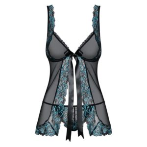 Das transparente Babydoll mit Spitze am Busen und am Saum verführt mit offener Front. Der passende String ist inklusive.