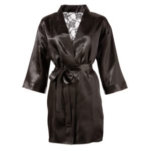Kurzer Kimono mit Arm, kleiner Bindeschleife vorne und abnehmbaren Bindegürtel in der Taille. Aus seidigem Satin. Im Rücken ganz aus semitransparenter Blütenspitze.