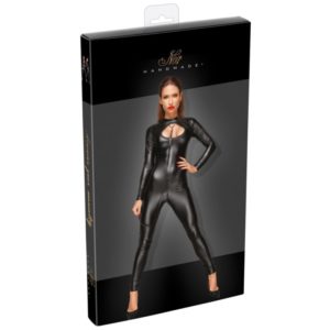 Overall mit rundem Ausschnitt am Dekolleté sowie Stehkragen mit Metallring vorne. An dem Ring ist eine 94 cm lange Leine mit Handschlaufe am Ende per Karabinerhaken befestigt. Mit Reißverschluss hinten und 2-Wege-Reißverschluss im Schritt. Körperbetonter Schnitt.