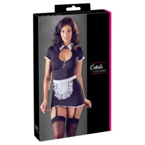 Tailliertes Strapskleid mit rundem Ausschnitt, Zierkragen sowie Spitzenrüschen an Ärmeln und Saum. Die Strapse sind verstell- und abnehmbar. Die Schürze zum Binden macht den sexy Look perfekt! Ohne Strümpfe.