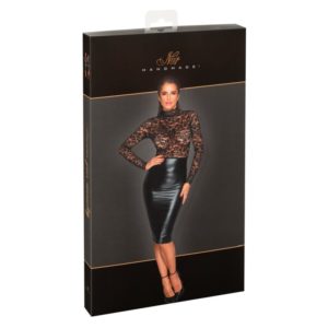 Knieumspielendes Langarm-Kleid in enger taillierter Schnittführung im schwarzen edlen Mix aus weicher Spitze (Oberteil) und matt glänzendem Powerwetlook (Rockteil). Kleiner Stehkragen hinten mit 2 Knöpfen zu schließen. Kleiner Gehschlitz im hinteren Saum.