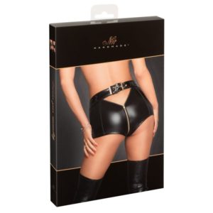 Knappe Pants im schwarzen, elastischen Powerwetlook. Lackbund hinten mit dekorativer goldfarbener Schnalle zum Verstellen. Der goldfarbene 2-Wege-Reißverschluss geht vom Bund durch den Schritt bis über den Po und endet mit einem kleinen Ausschnitt direkt unter der Schnalle.