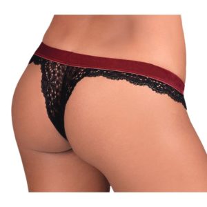 Riostring aus weicher elastischer schwarzer Spitze mit bordeauxfarbenem Samtbund, verziert mit einem kleinen Schleifchen.