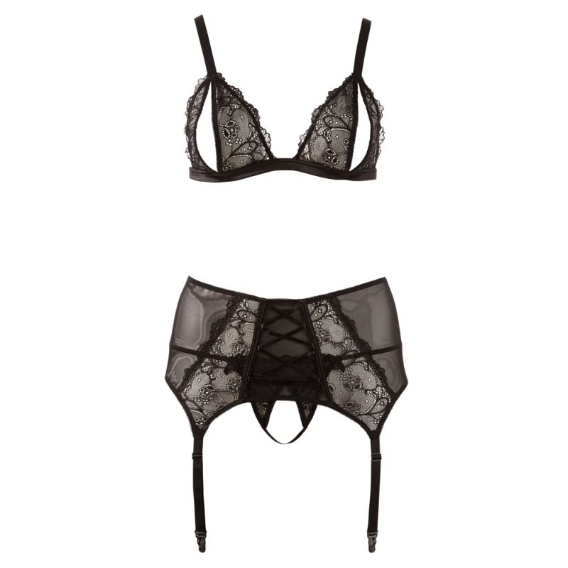 Soft-BH mit offenen Cups, verstellbaren Trägern und Hakenverschluss hinten. Strapsgurt mit Zierschnürungen und vier verstellbaren Strapsen. Dazu passender String.