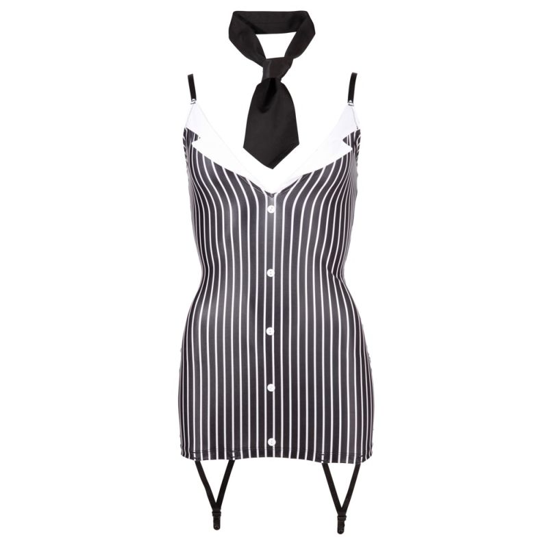 Eng anliegendes Minikleid mit verstellbaren Trägern und zwei Strapshaltern vorn. Aufgesetzte Knöpfe vorn und angedeuteter Kragen am tiefen Ausschnitt. Inklusive Krawatte zum Binden.