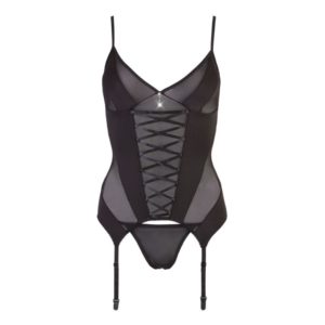 Strapshemd und String aus schwarzem, transparentem Powernet im Set. Strapshemd zusätzlich mit leicht blickdurchlässigen Einsätzen. Vorne mit Zierschnürung und Strassaccessoire, hinten Häkchenverschluss. Träger verstellbar.