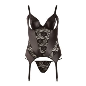 Strapshemd mit verstellbaren Strumpfhaltern, geschlitzten Cups und Spitzeneinsätzen vorne. Mit langem Hakenverschluss im Rücken und passendem Spitzenstring.