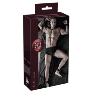 Bettfessel aus 4 stabilen Webgurten (max. Länge 130 cm pro Gurt) mit Verbindungssteg (max. Länge 130 cm) sowie Fesselschlaufen an den Enden für Hände und Füße, die sich stufenlos verstellen und per Karabinerhaken befestigen lassen. Textil: 100% Polyester, Metall.
