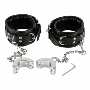 Hand Cuffs & Cock Ring von fetish collection: Handfesseln plus Edelstahl-Penisring mit zwei fest arretierten, kurzen Karabinerketten zum Einhaken in die Handfesseln. Die weich gepolsterten Handfesseln in stilechter Lederoptik sind durch Schnallenverschlüsse passend im Umfang von 17 cm bis 29 cm verstellbar. Der Edelstahl-Penisring wird mit einem Inbusschlüssel (inkl.) geöffnet und verschlossen.