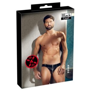 Klassischer schwarzer Slip aus längs- und querelastischem 4-Wege-Stretch-Lack mit unterlegtem Front-Reißverschluss aus silberfarbenem Metall. 94% Polyester, 6% Elasthan, mit Polyurethan-Beschichtung.