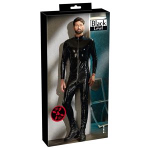 Hochelastischer, glänzender Lack-Overall aus 4-Wege-Stretch. Mit kleinem Stehkragen und 3-Wege-Metallreißverschluss, der lasziv bis in den Schritt verläuft.