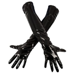 Lange, schwarz glänzende Handschuhe bis über die Ellenbogen. Eingearbeitete Stretcheinsätze sorgen für perfekten, hautnahen und dennoch bequemen Sitz. 90% Polyester, 10% Polyamid, mit Polyurethan-Beschichtung.