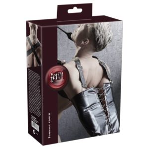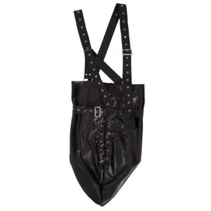 Perfekt für Deine bizarren Fantasien! Armsack mit Schnürung und Riemen um die Arme. Inklusive verstellbaren Schulterriemen, die vor der Brust gekreuzt werden. Solide verarbeitet in edler Leder-Optik. 98% Polyester, 2% Elasthan Beschichtung Polyurethan.