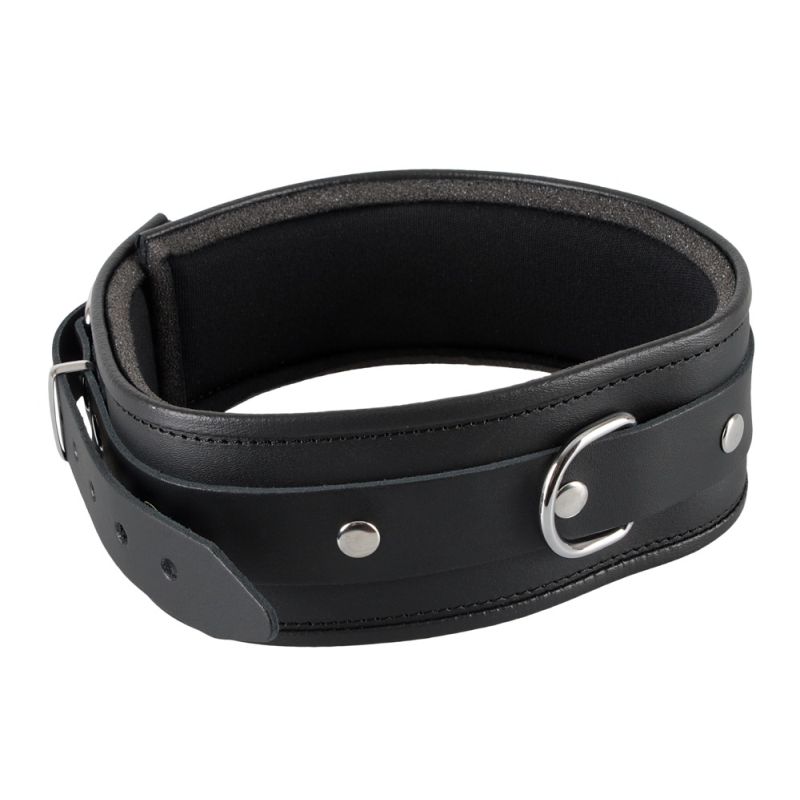 Gepolsterte Halsmanschette mit eingefassten Kanten. Vorne mit D-Ring. Schwarz. Mit Schnallenverschluss verstellbar. Material: Spaltleder, Metall.
