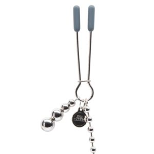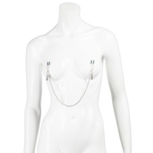 Diese silberne Brustklemmenkette mit den Kugelketten an beiden Seiten ist das ideale Accessoire für Busen, denn so ist alle Aufmerksamkeit sicher. Die gewünschte Druckintensität kann ganz einfach per Schiebereing eingestellt werden für angenehmen oder intensiveren Tragekomfort, der zusätzlich durch den schwarzen Silikonüberzug erhöht wird.Die Verbindungskette ermöglicht interessante Stimulationsspiele. Inklusive Satin-Aufbewahrungsbeutel.