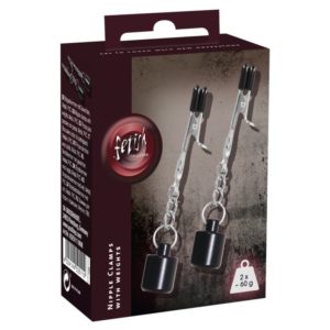Diese schwarz/silbernen Brustgewichte sehen geil aus und sorgen für erregend prickelnde Trage-Gefühle. Mit soft gezahnten Nippel-Clips unter den abnehmbaren Kunststoff-Schonbezügen. Auch z.B. an Schamlippen und Hoden tragbar.
