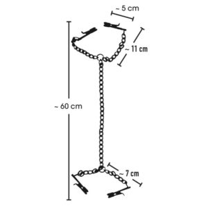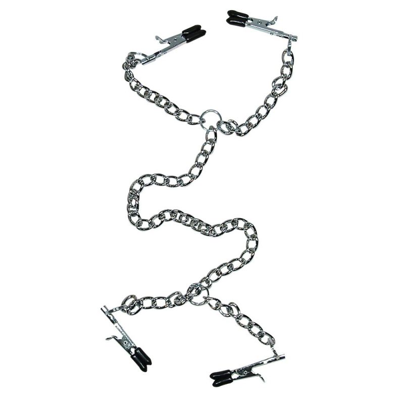 Zwei Nippel- und zwei Schamlippen-Clips sind durch robuste Ketten miteinander verbunden. Clips sanft gezahnt, mit abnehmbaren Schonbezügen. Silberfarbenes Metall.