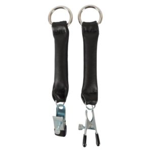 Nippelklemmen mit Lederriemen und Metallringen. Der Druck der mit Kunststoffüberzug gepolsterten Klemmen kann individuell eingestellt werden, während die Ringe die Möglichkeit geben, mehr Gewicht einzuhängen.