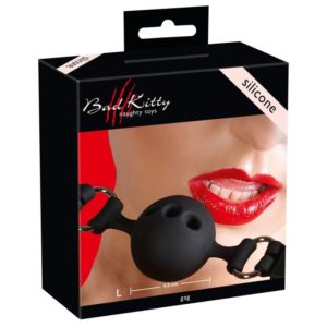 Schwarzer Knebel mit Luftlöchern fürs lange Durchhalten und verstellbarem Riemen. Knebel-Ø 4,5 cm. Material: Silikon.
