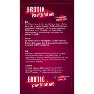 Erotisches Kartenspiel für mindestens 2 Spieler. Inhalt: 55 Karten mit jeweils vier Begriffen aus den Bereichen Fetisch & Versautes, Toys & Dessous, Sexualpraktiken & Vorspiel, Verschiedenes. Der Spieler, der eine Karte zieht, wählt eine Kategorie aus und muss dann den Begriff den Mitspielern pantomimisch darstellen. Inklusive Spielanleitung auf Deutsch und Englisch.