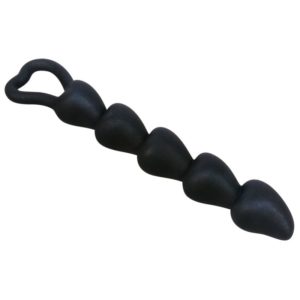 Samtweicher Analkugelstring aus fünf aneinander gereihten Kugeln in Herzform und Rückholring. Schwarz. Gesamtlänge 18,5 cm, Einführtiefe 15 cm. Ø 1,3 bis 2,6 cm. Material: Silikon.