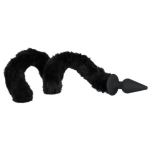 Konisch geformter Analplug mit kleinem Sockel, an dem ein Kunstfell-Schwanz (ca. 62 cm lang) befestigt ist. Schwarz. Plug ca. 11 cm lang, Ø max. 4 cm. Material: Silikon (Plug), Viscose (Schwanz).