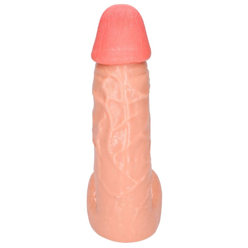 Hautfarbener biegsamer Riesen-Dildo mit praller Äderung, ausgeprägter Eichel und realistischen Hoden. 20,5 cm Gesamtlänge, Ø 5 cm. Auf Standfuß. Material: PVC.