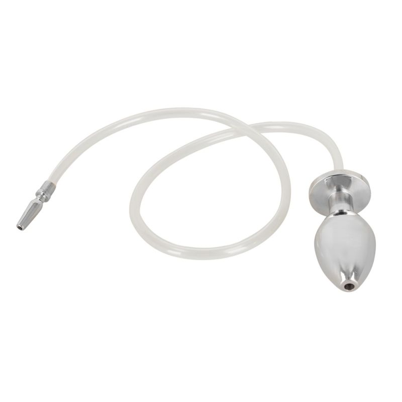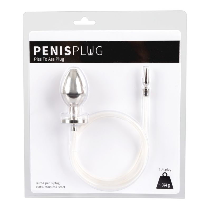 Der hohle, schwere Analplug ist über den Schlauch mit dem offenen Penisplug verbunden. Analplug: Gesamtlänge 7,8 cm, Ø max. 3,7 cm, 374 g schwer; Penisplug: 3,3 cm, Ø max. 0,9 cm; Schlauchlänge 62 cm. Inklusive Ersatzschlauch in Schwarz.