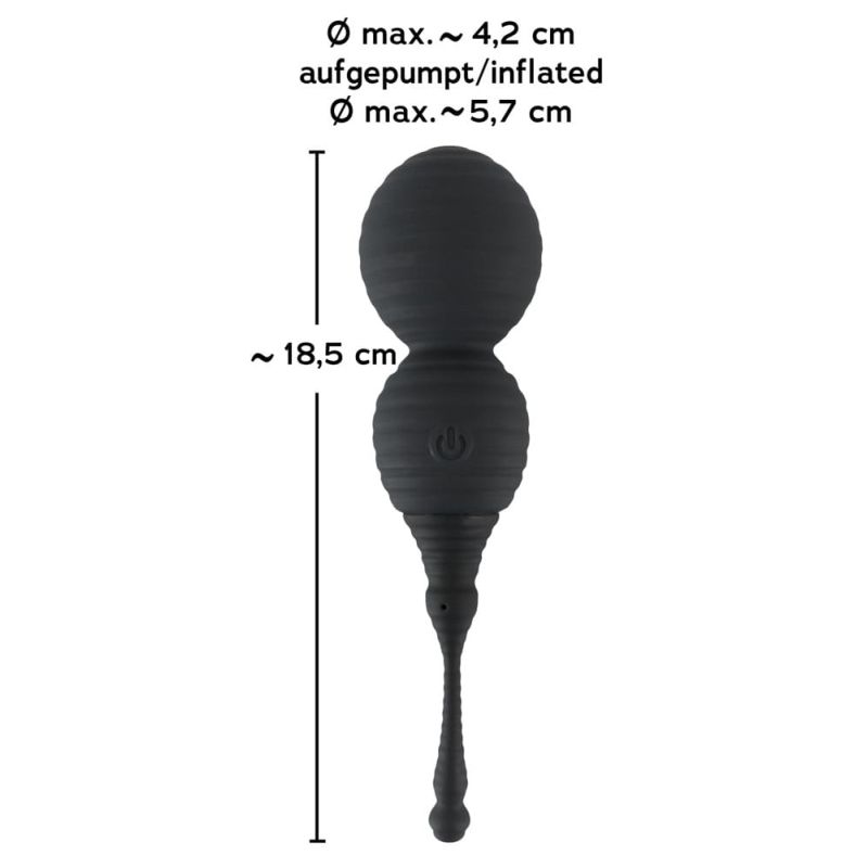 Ausgeprägt reizstrukturiertes Vibrokugel-Duo Love Balls von RC + Inflatable mit elastischem Rückholbändchen. Die Endkugel lässt sich dick und prall aufpumpen – für ein herrlich ausgefülltes Gefühl und ein effektives Liebesmuskel-Training.