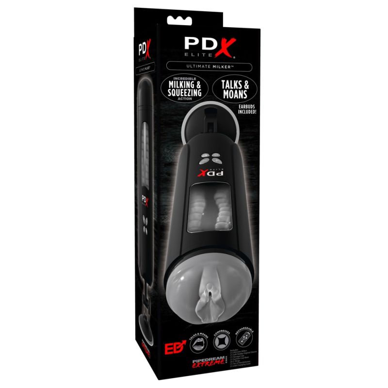 Schwarzer Masturbator mit 10 Melkstufen und 5 Geschwindigkeiten. Soundfunktion mit mehreren Lauten und Sprüchen kann über Kopfhörer genutzt werden, die im Lieferumfang enthalten sind. Herausnehmbarer Sleeve ist ausgestattet mit Reizrillen und Noppen. Fenster zum Reinschauen und LED Licht. Inklusive Saugfuß, 3 Penisringen und USB-Ladekabel.