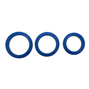 3er-Set blaue Penisringe. Auch zur Hodenschnürung. Einzeln oder in Kombination zu verwenden. Stark dehnbar. Ø 4,5 cm, 4 cm und 3,5 cm. Material: Silikon.