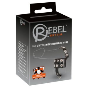 Penisriemen 1,6 cm breit, Ø 3,5 cm/4 cm/4,5 cm; Hodenriemen 4 cm breit, Ø 3,5 cm/4,5 cm, Hodenteiler 2 cm/3 cm lang. Gewicht 27 g. PU, Metall.
