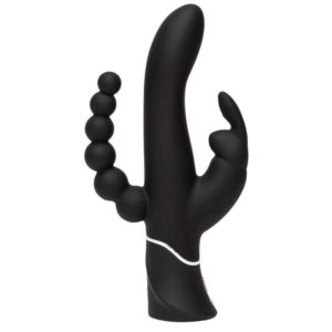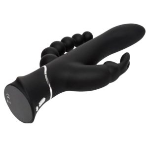 Ein absoluter Alleskönner, der Vagina, Anus, G-punkt und die Klitoris gleichzeitig stimuliert. Der Vibrator kommt als Trio bestehend aus dem leicht gebogenen Schaft mit Klitorisreizarm in Hasenform mit beweglichen Ohren und kugeliger Analkette. Der Vibrator besitzt drei Motoren – je einer in Schaft, Klitorisreizarm und Analkette; im Schaft stehen Ihnen 12 Vibrationsmodi per Knopfdruck zur Verfügung, in Klitorisreizarm und Analkette sind es je 9 Modi, letztere können allerdings nur zusammen verwendet werden. Der Doppelvibrator besitzt eine Reisesperre gegen versehentliches Einschalten und ist wiederaufladbar mit beiliegendem USB-Ladekabel.